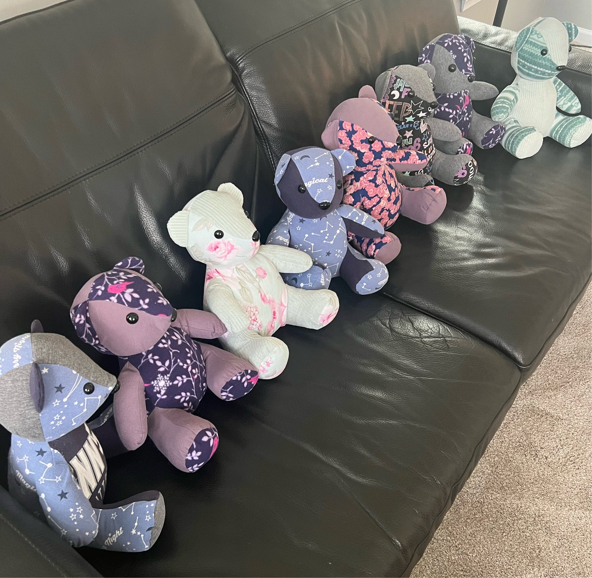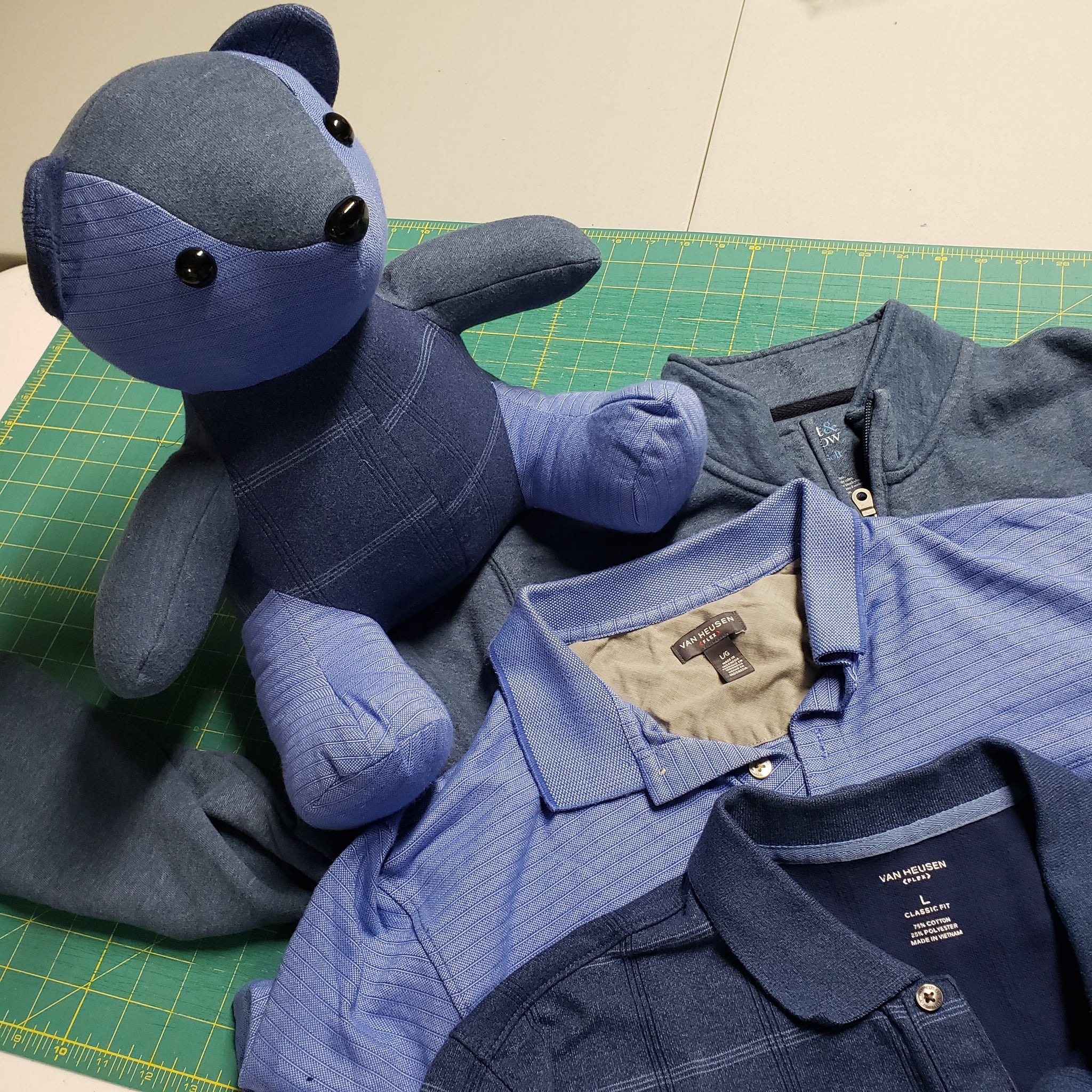 A decorative bear made from treasured clothing. May use one large adult size shirt, multiple shirts, or even multiple baby clothes.